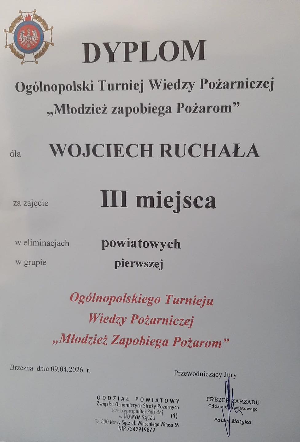 Sukces naszego ucznia w Eliminacjach Powiatowych do Ogólnopolskiego Konkursu Wiedzy Pożarniczej „Młodzież zapobiega Pożarom”!